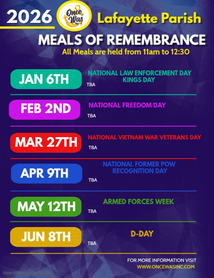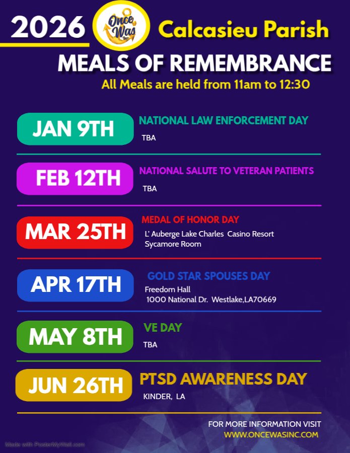 Meals of Remembrance is one of the most meaningful outreach programs hosted by Once Was Inc — a 501(c)(3) nonprofit organization dedicated to honoring service, supporting families, and empowering veterans throughout Southwest Louisiana.